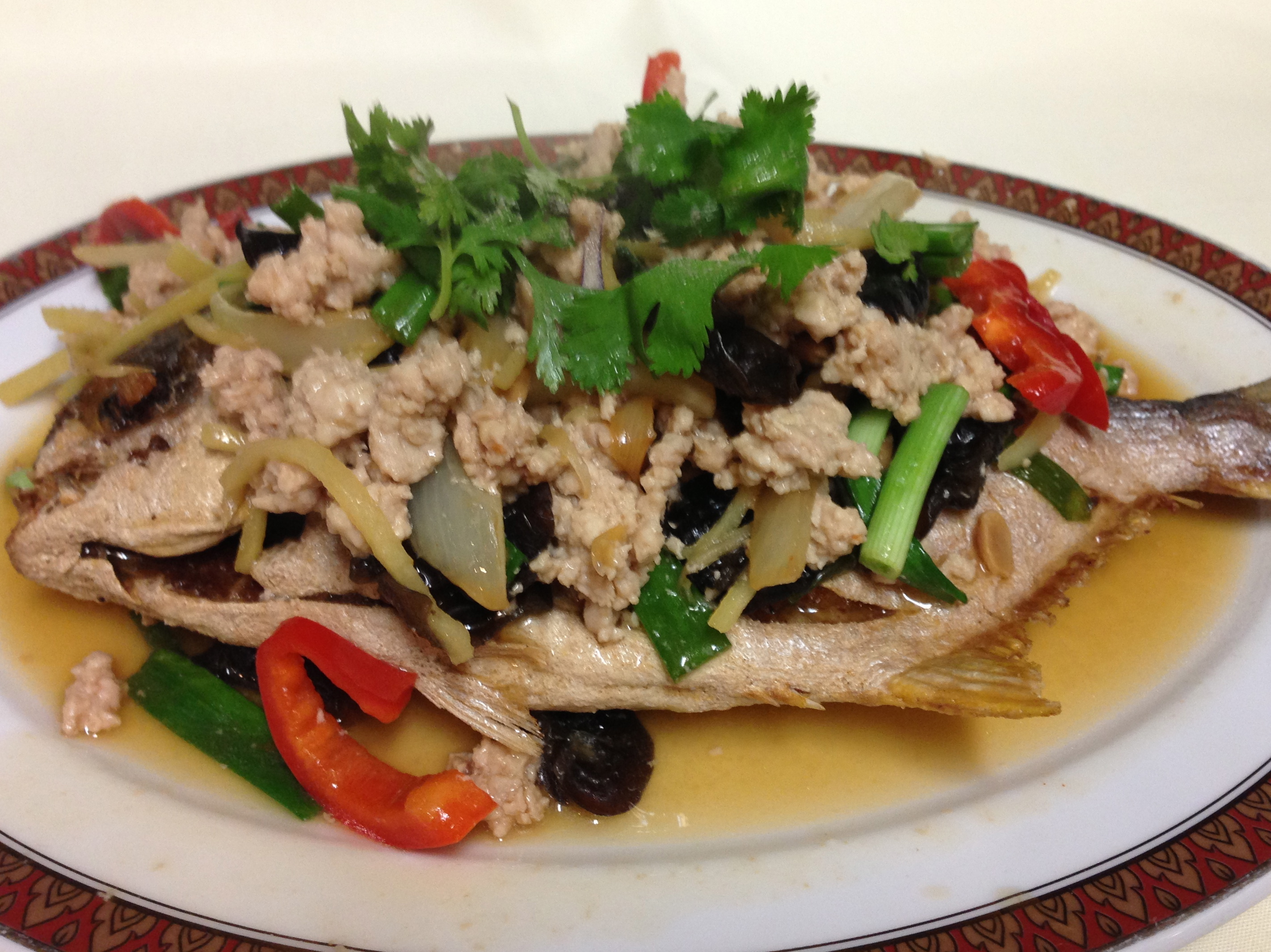 Crispy deep fried pompano fish topped with ground pork, ginger and scallions in gravy.