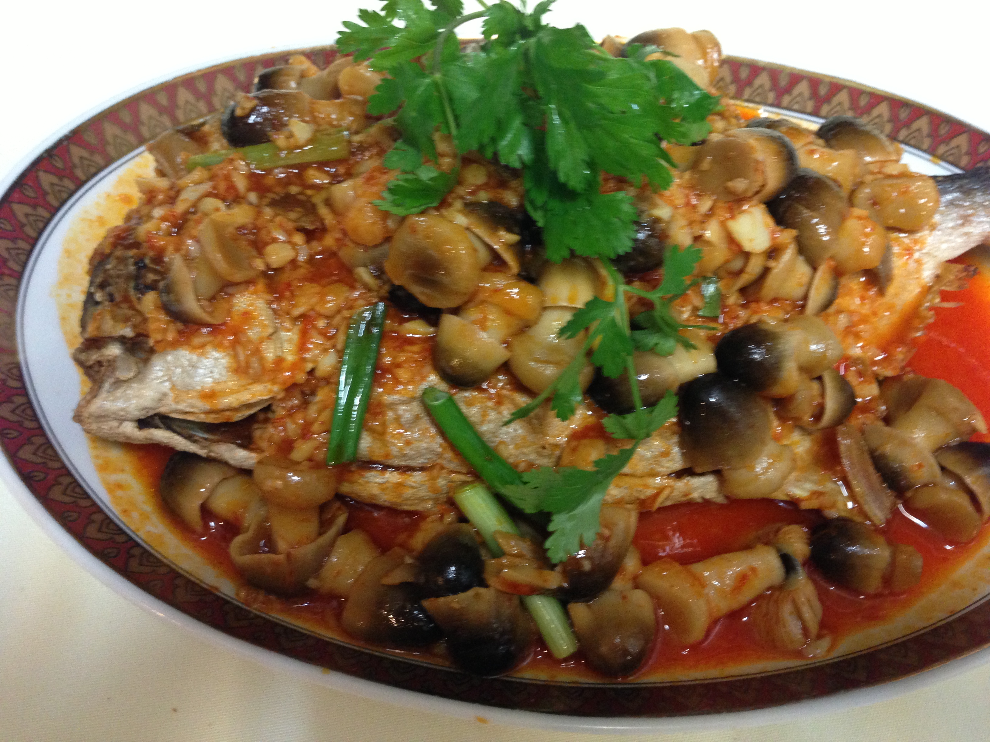 Crispy deep fried pompano fish Thai spicy chili garlic and mushroom topping.